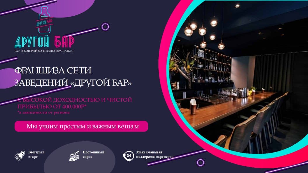 Чем франшиза «Другой Бар» лучше бизнеса с нуля? Приобретая франшизу «Другой бар», вы получаете всю необходимую информацию по ведению успешного бизнеса.