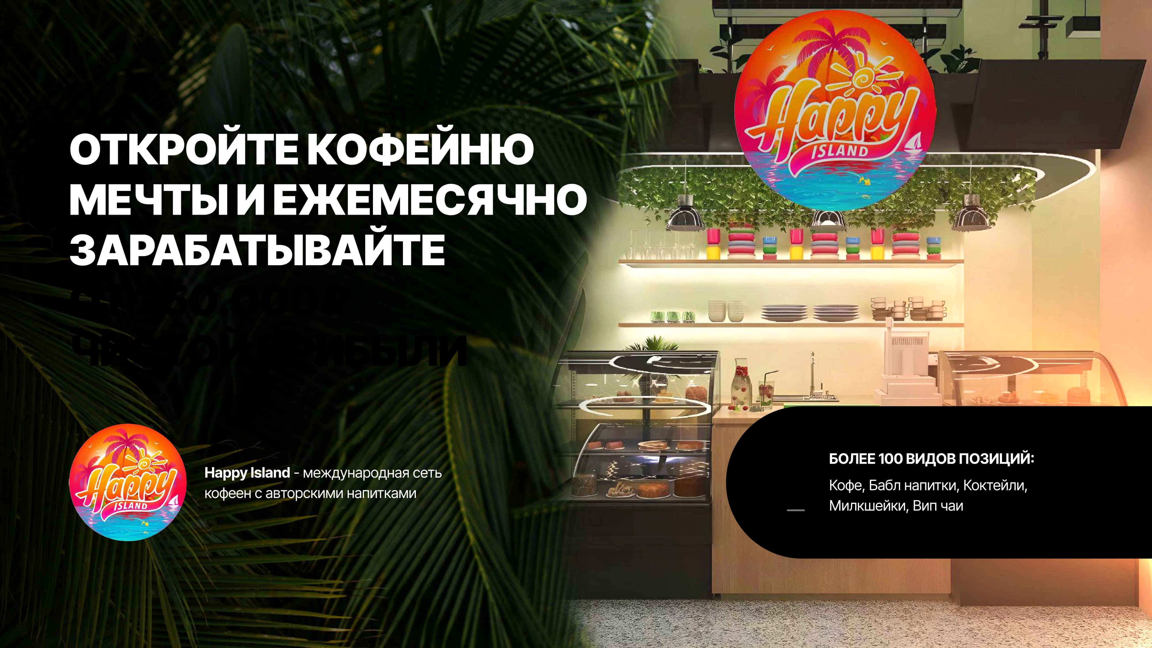 Компания Happy Island была основана в 2019 году и на данный момент является сетью кофеен формата с широким выбором авторских напитков. Начиная с 2023 года, мы начали развивать франчайзинговое направление по всей России. Сейчас под нашим брендом работают уже 30 точек, нашей целью является запуск 100 партнеров к концу 2025 года.