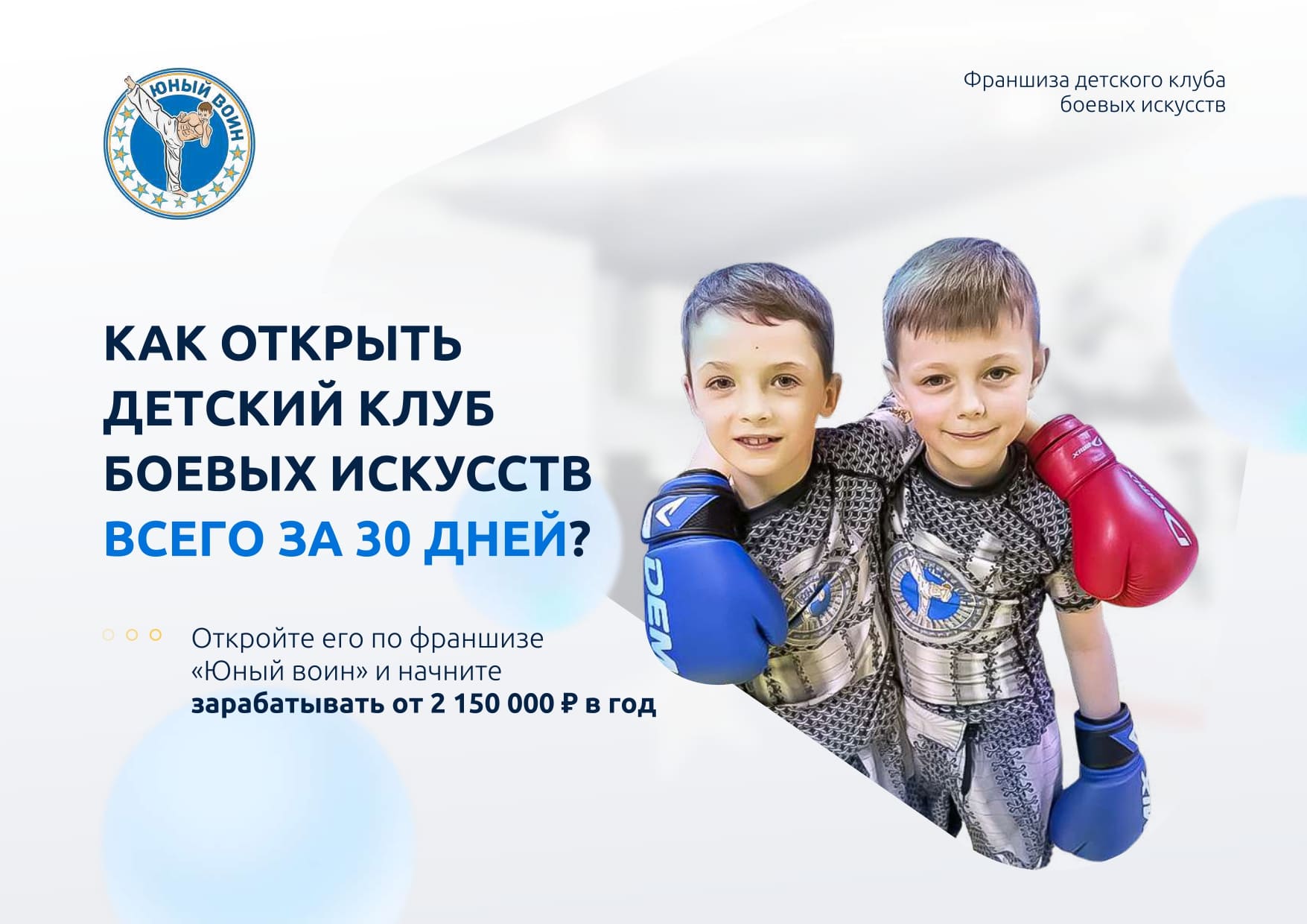 Клуб боевых искусств "Юный воин" предлагает уникальную франшизу, основанную на многолетнем опыте воспитания детей через занятия единоборствами. Наша миссия заключается в физическом, психологическом и эмоциональном развитии детей в благоприятной среде, что способствует их здоровой социализации.