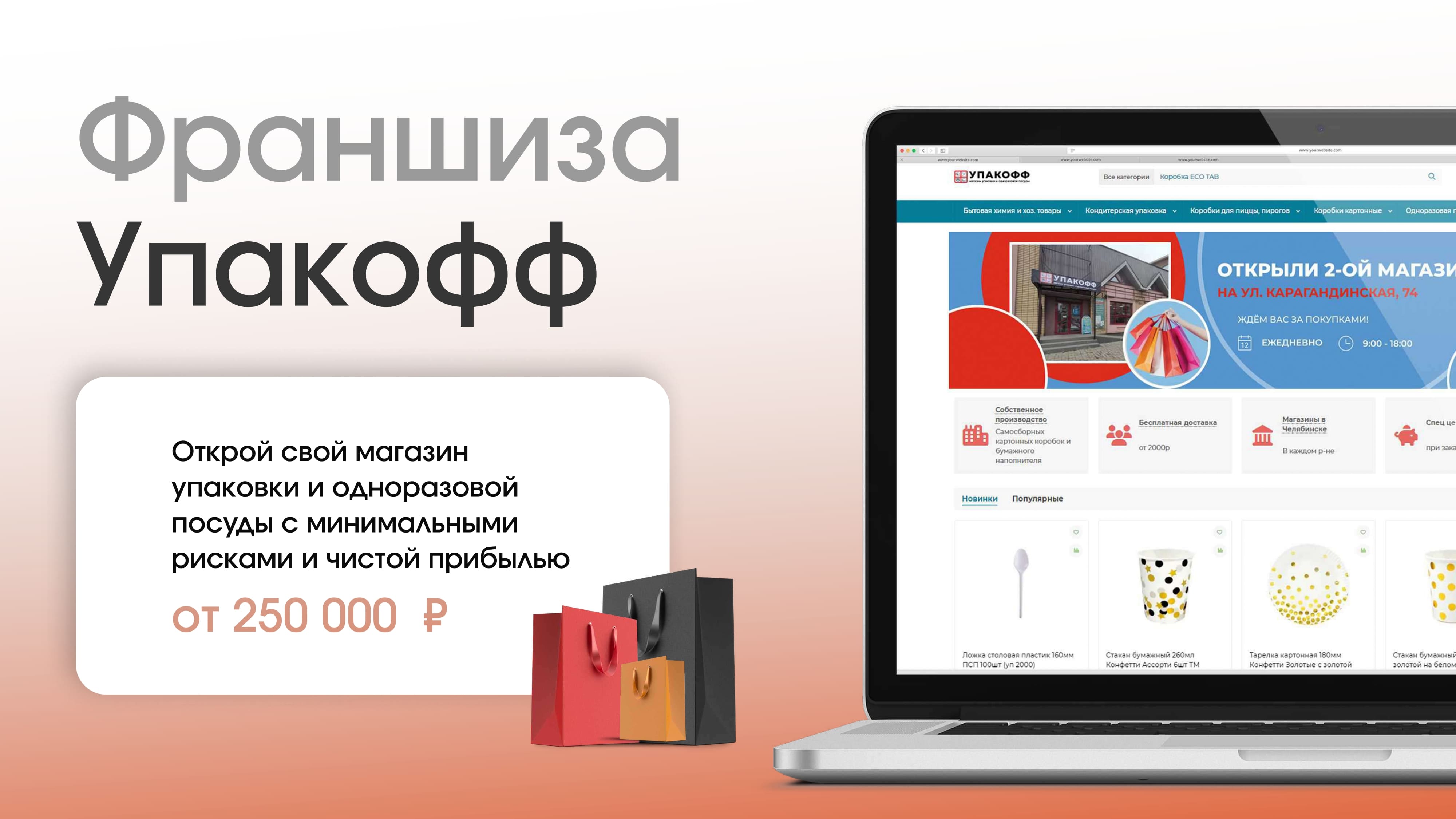"Упакофф" — это сеть оптово-розничных магазинов, занимающаяся продажей упаковки, одноразовой тары и посуды. С момента основания в Челябинске мы успешно развиваемся уже 6 лет. Сегодня сеть охватывает 20 магазинов в 8 городах России: Челябинск, Уфа, Екатеринбург, Оренбург, Пермь, Магнитогорск, Новосибирск и Миасс.4